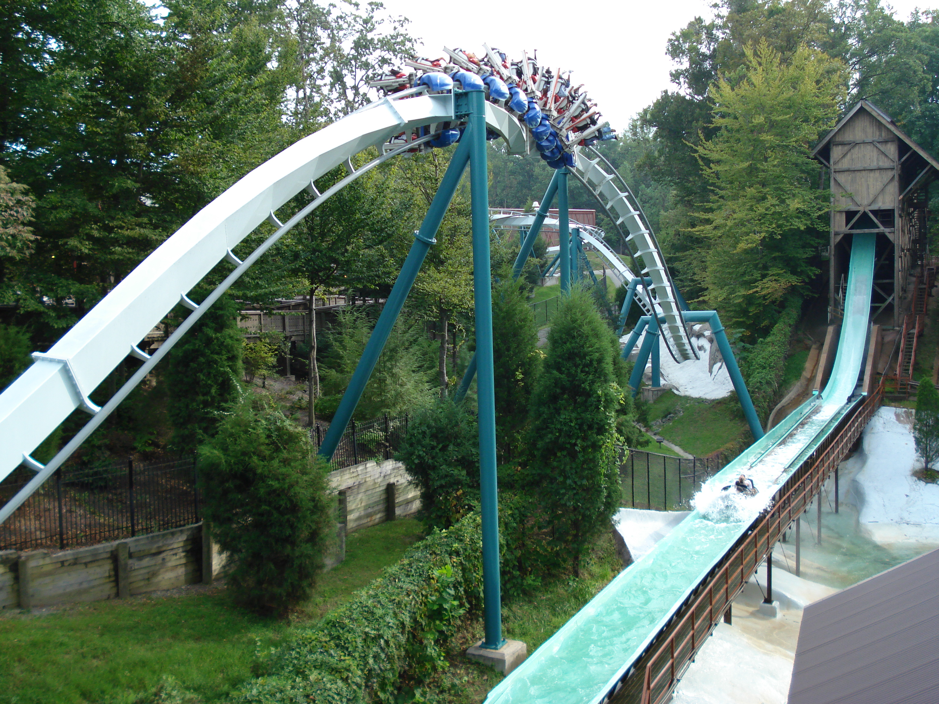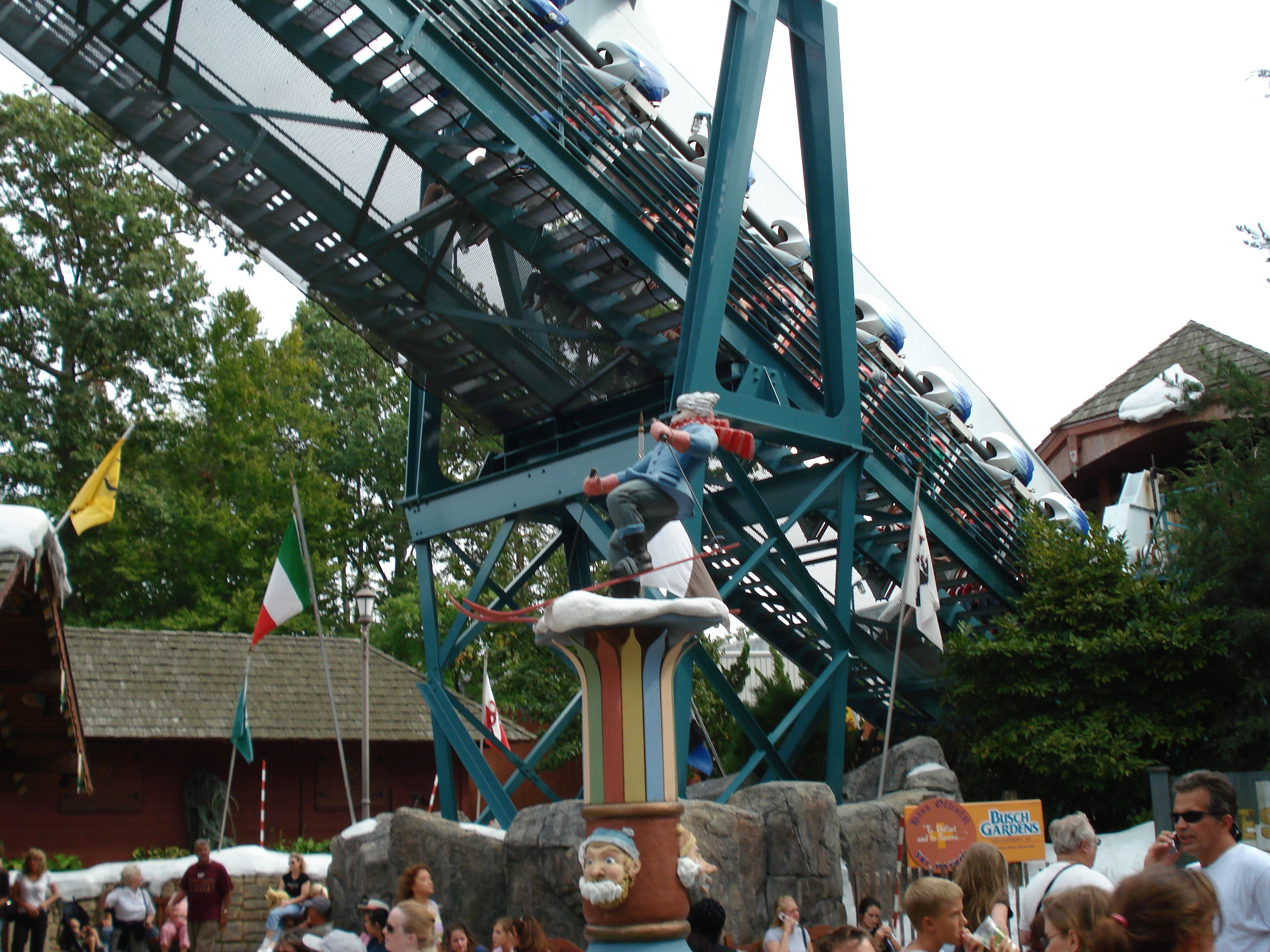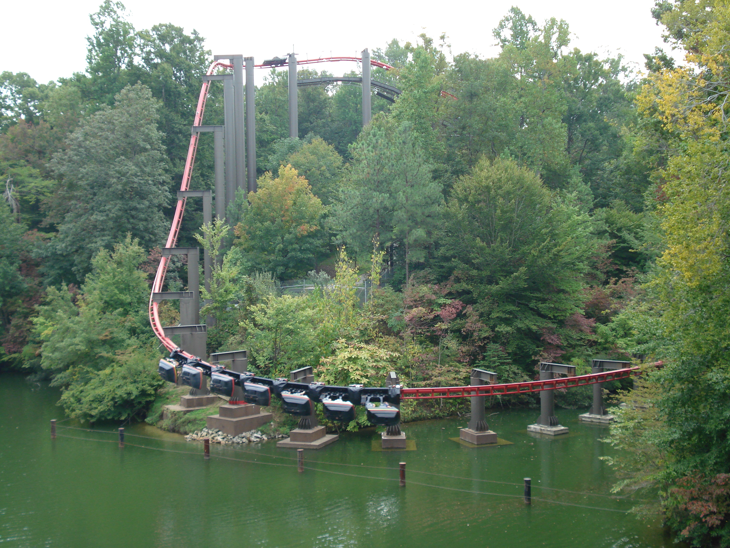 This coaster was built and designed by B&M ( Bolliger & Mabillard) and opened here in 2009. It is one of the few Dive coaster models they have built and the second that was built in the USA behind SheiKra at its sister park, Busch Gardens Tampa. A Dive coaster is one that has two or three rows that seat between eight and ten people across and has a holding brake at the top of the first drop so that riders are left dangling over the edge between one to five seconds before being released. Griffon stands at 205 feet tall with the first and second drop angle at ninety degrees, has two inversions, a splashdown water effect that doesn’t get riders wet, a total track length of 3,108 feet, a top speed of 71 mph, and a ride time of about three minutes. This was the worlds first dive coaster to feature trains that are completely FLOORLESS. This is definitely a must ride and I recommend the front row for first time riders as the view from up top is simply spectacular. The splashdown effect does not get riders wet at all, in fact, it soaks unsuspecting pedestrians that are walking by the pool.