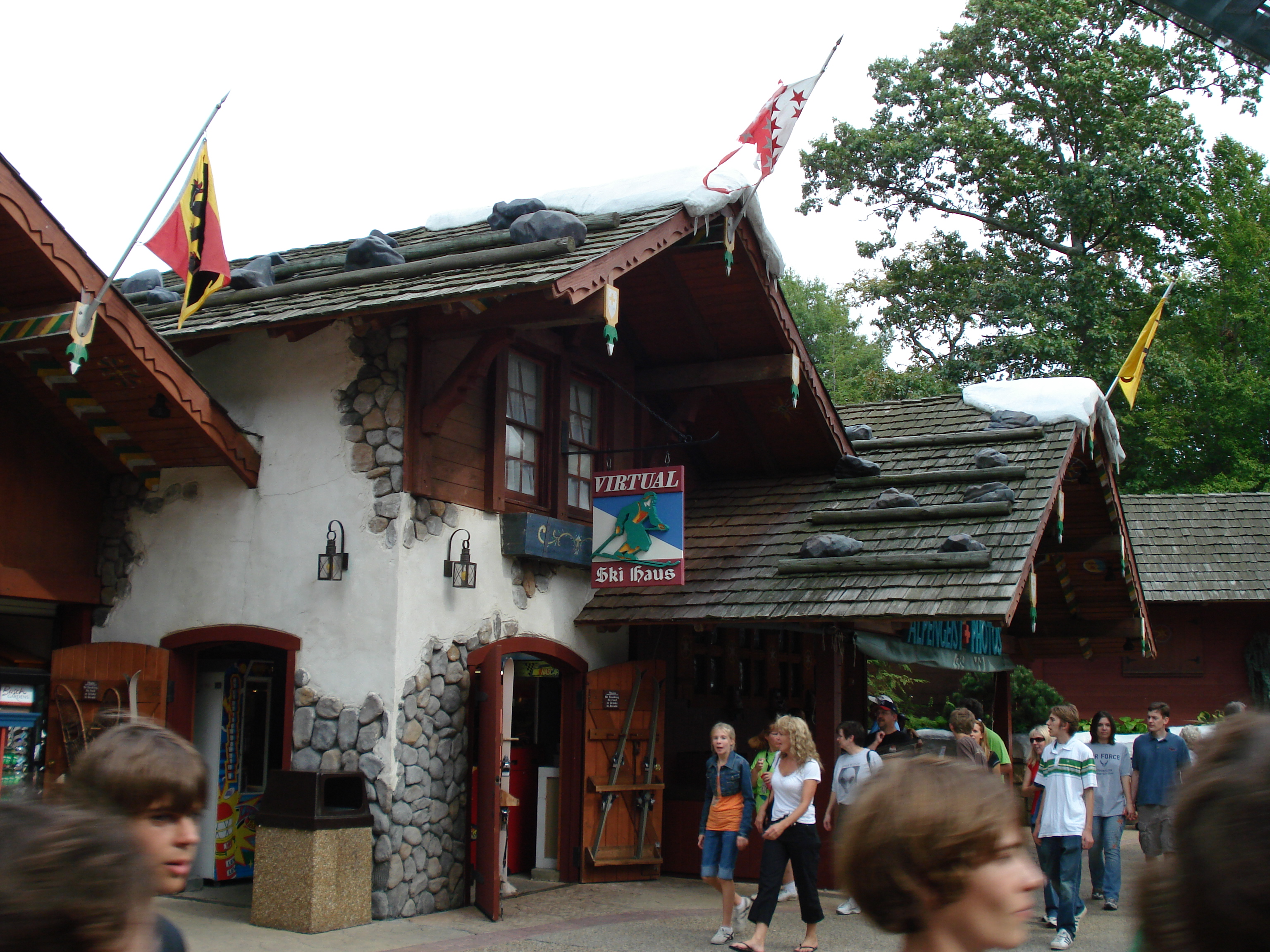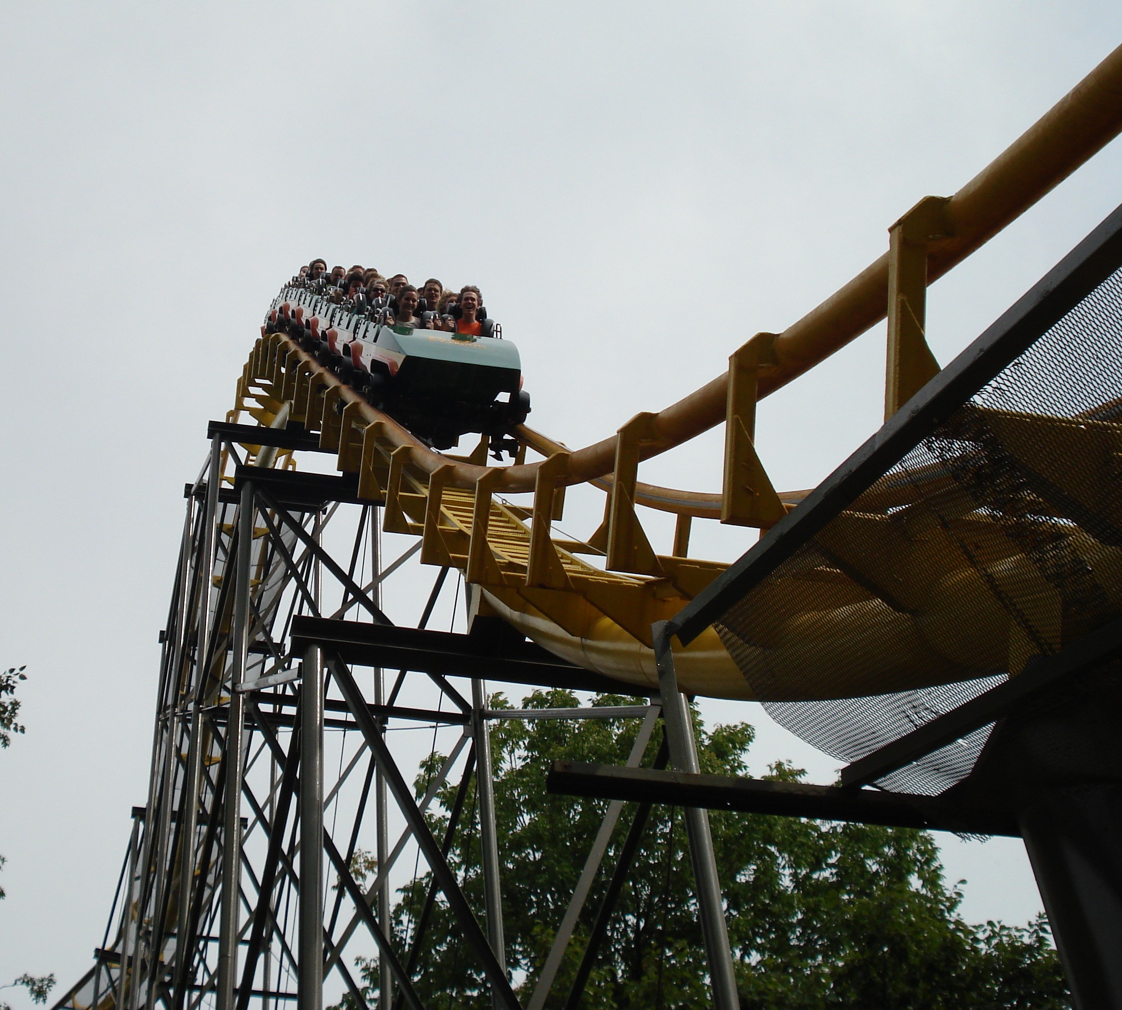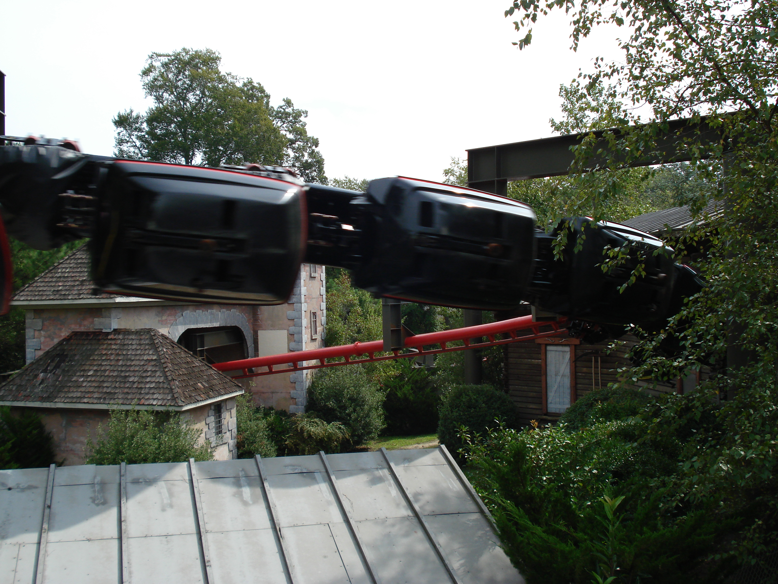 Then the coaster travels through a German village and then goes off into the woods through a series of upward and downward flat spins where it ascends another, much larger, lift hill about 100 feet high.