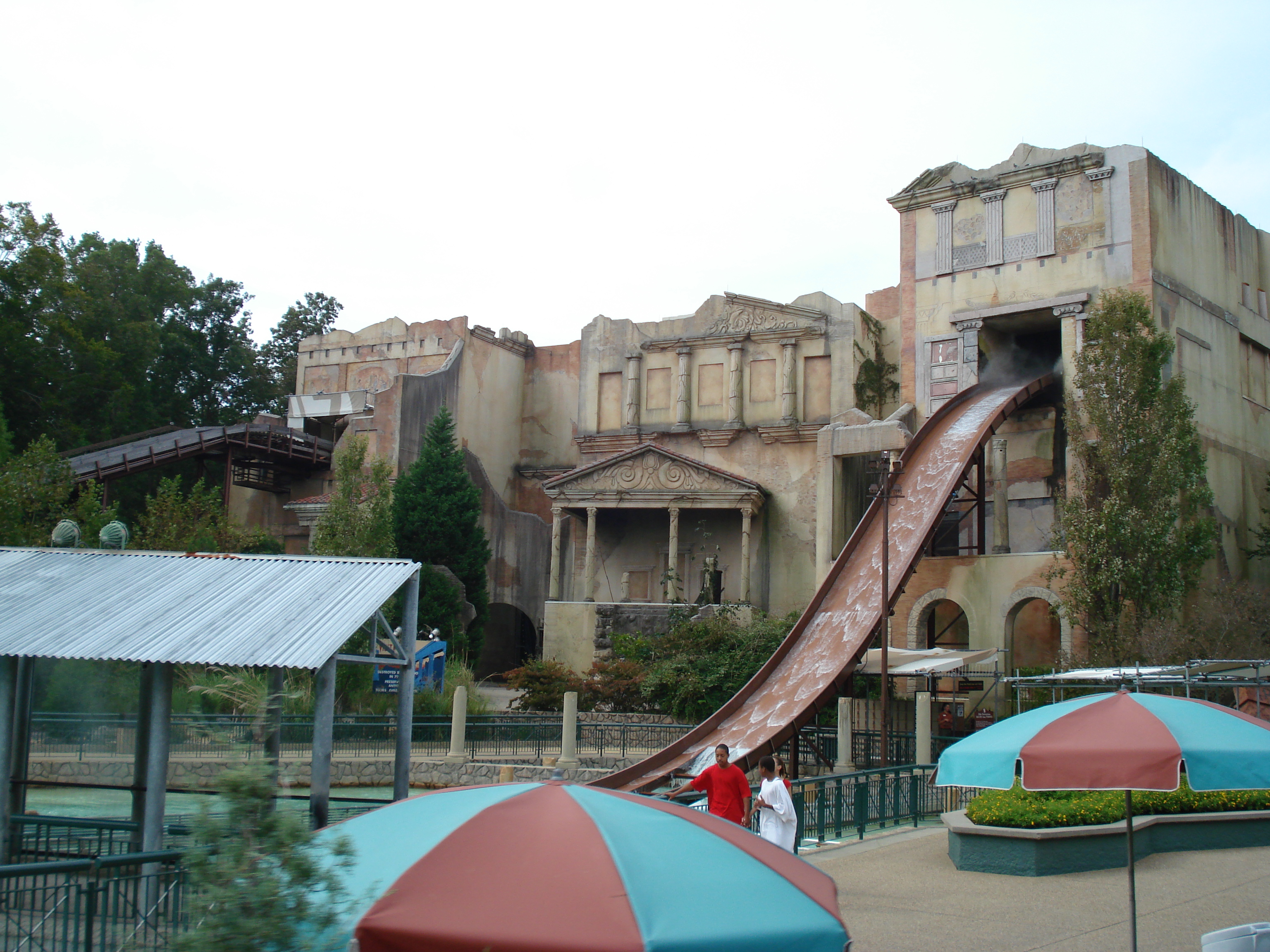 This area is set to the return of Marco Polo’s return from his famous trip to China. Most of the parks’ midway games are here with a festival theme. All the rides in this area are themed around Roman mythology. There are three flat rides, a water ride, and a roller coaster in this area as well as a few small gift shops where you can purchase ride related items. The flat rides are the Turkish Delight which is a spinning tea cups ride, Tradewinds, which is a permanent Music Express type ride, and Elephant Run, which is a kid friendly bobsled type ride. Next up is the roller coaster.