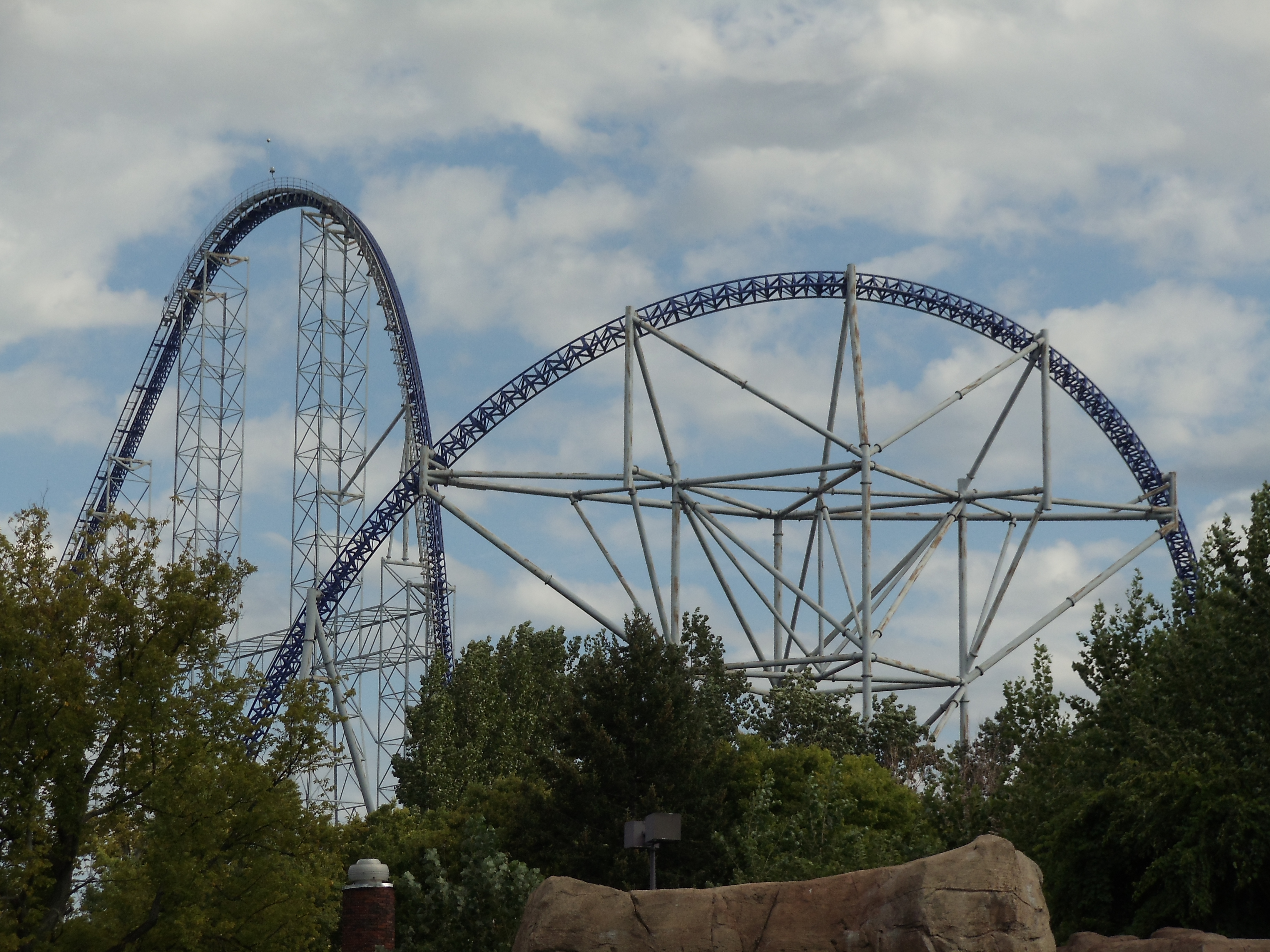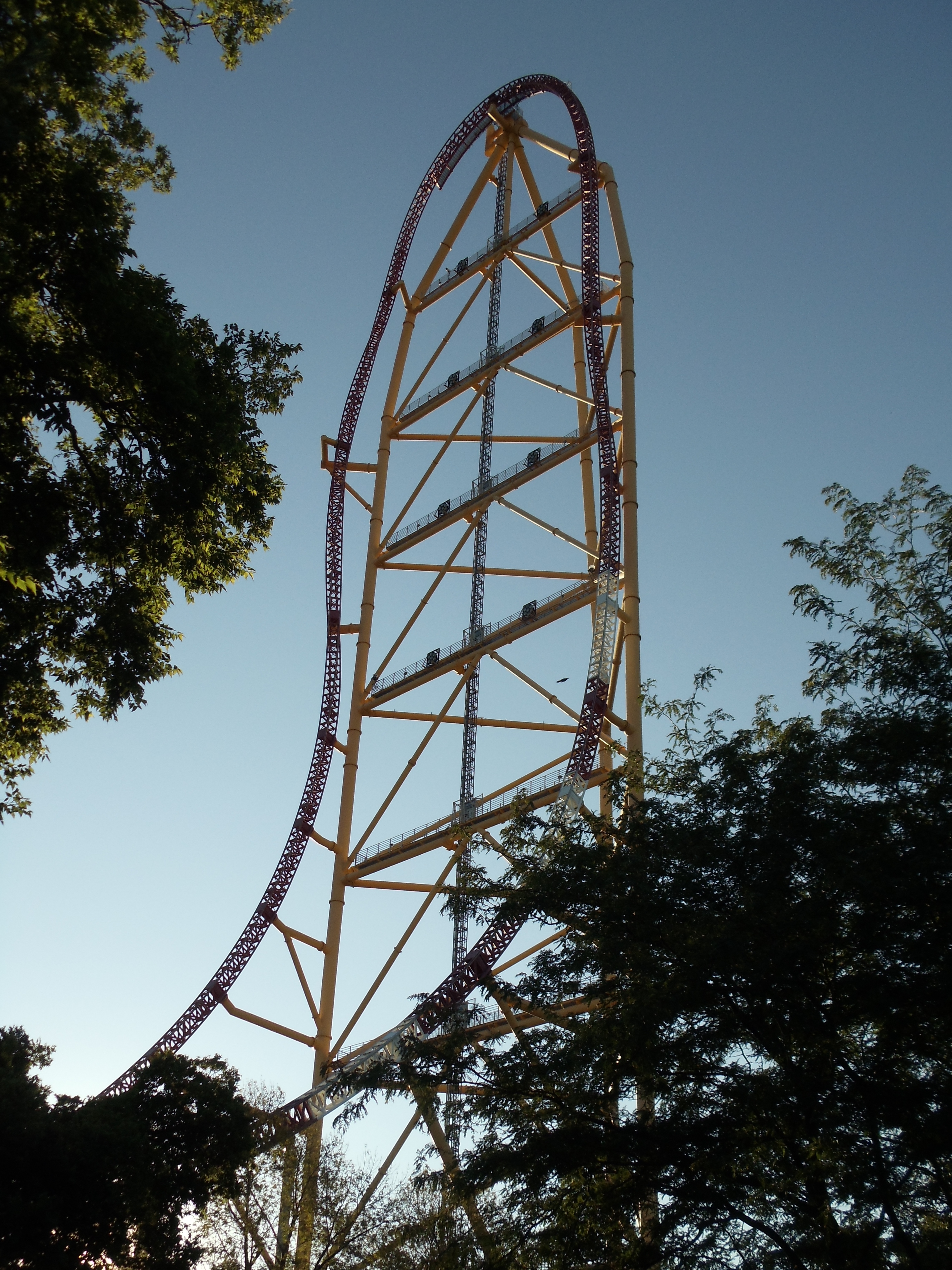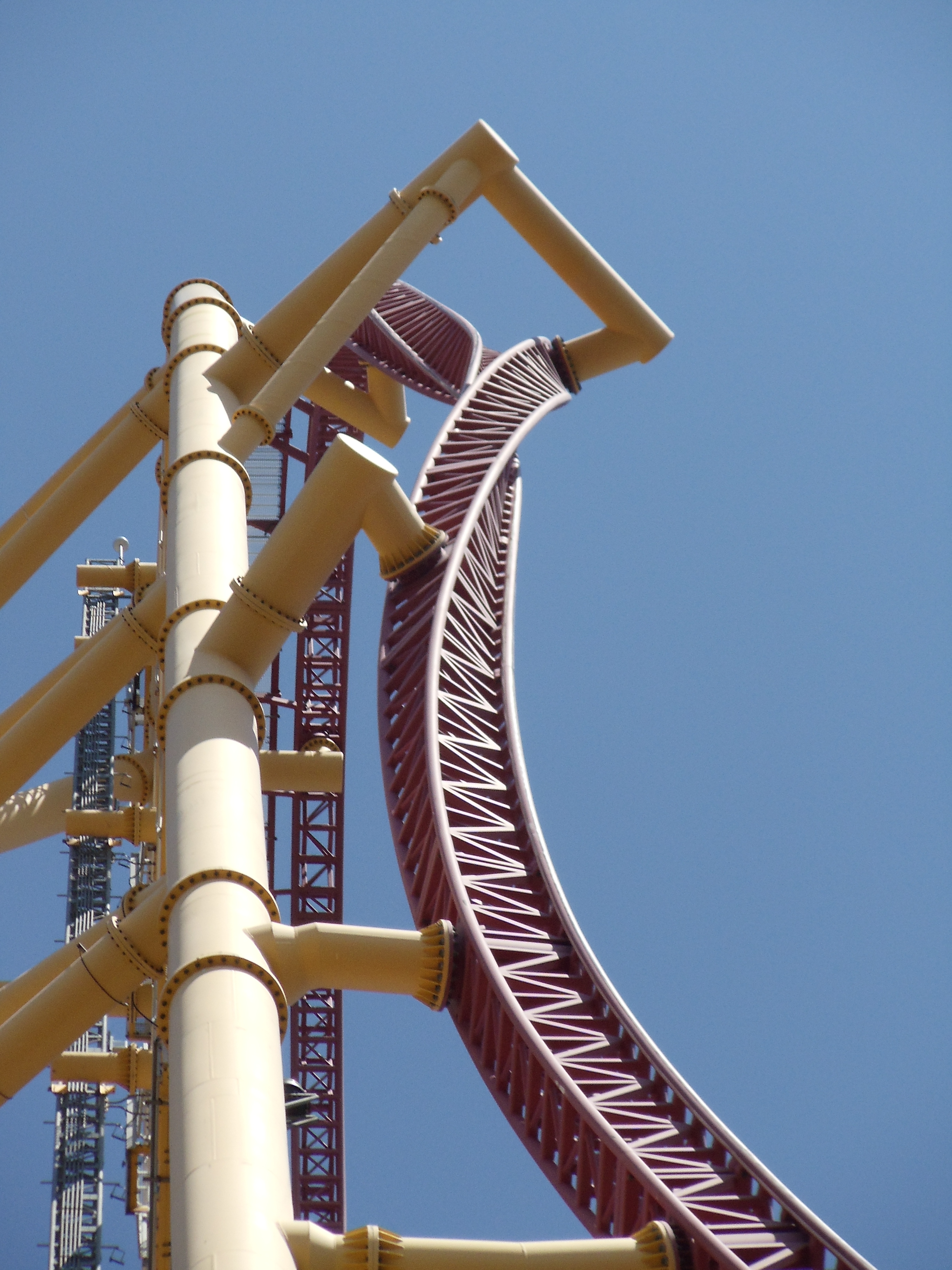 This monster of a coaster was designed and built by Intamin AG and it opened on May 4, 2003 as the worlds’ tallest at 420 feet, and the worlds’ fastest at 120 mph roller coaster. This coaster is also a launch coaster that rockets riders from zero to 120 mph in just over three seconds. Riders board the Dragster themed trains and are secured using a three-point seat belt harness and a lap bar that locks you into your seat. The train is then moved into the launch position right next to the “Christmas Tree” light stand. The Christmas Tree is something you see at drag racing events, it’s the stand of lights that sits between the two drag racers as they wait for the green light at the start line. As you approach the Christmas Tree, speakers turn on blaring sounds from a dragster revving their engine waiting for the green light and giving instructions to keep your arms down, head back, and to hold on. The Christmas Tree flashes three yellow lights and then the green and your off. The train ascends straight up the 420 foot tall hill just after the pneumatic catapult releases the train. Once up top, you can see for miles but only briefly as you then return to the ground but not before going through a 720 degree twist.