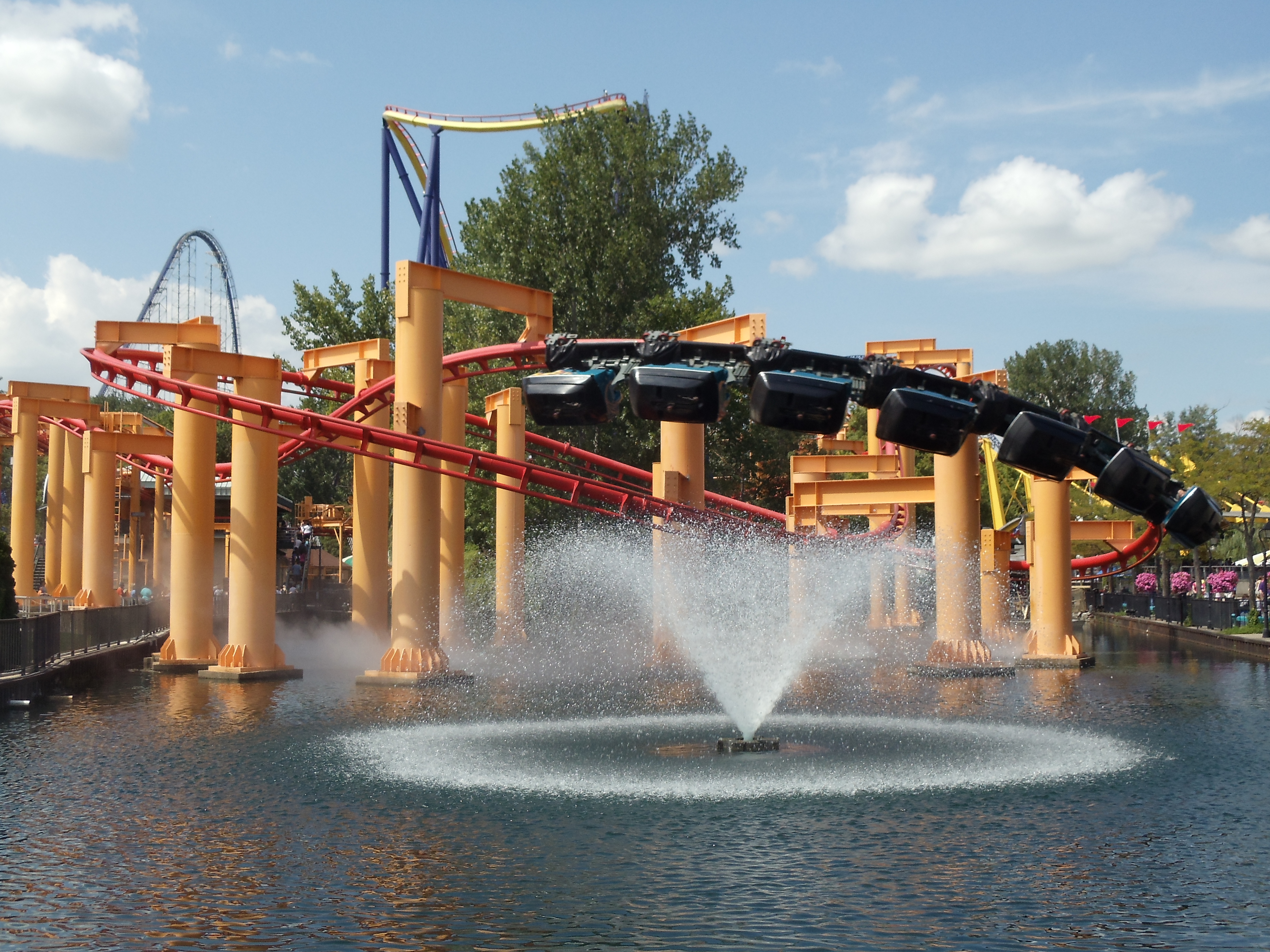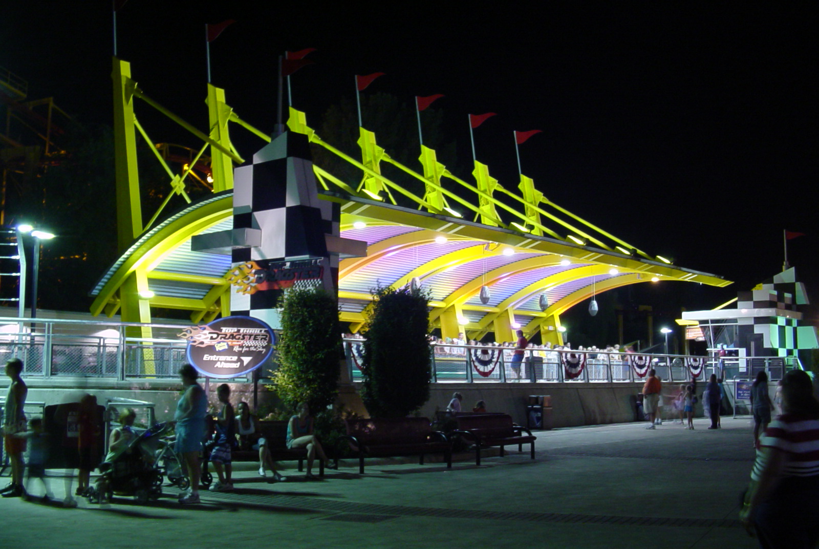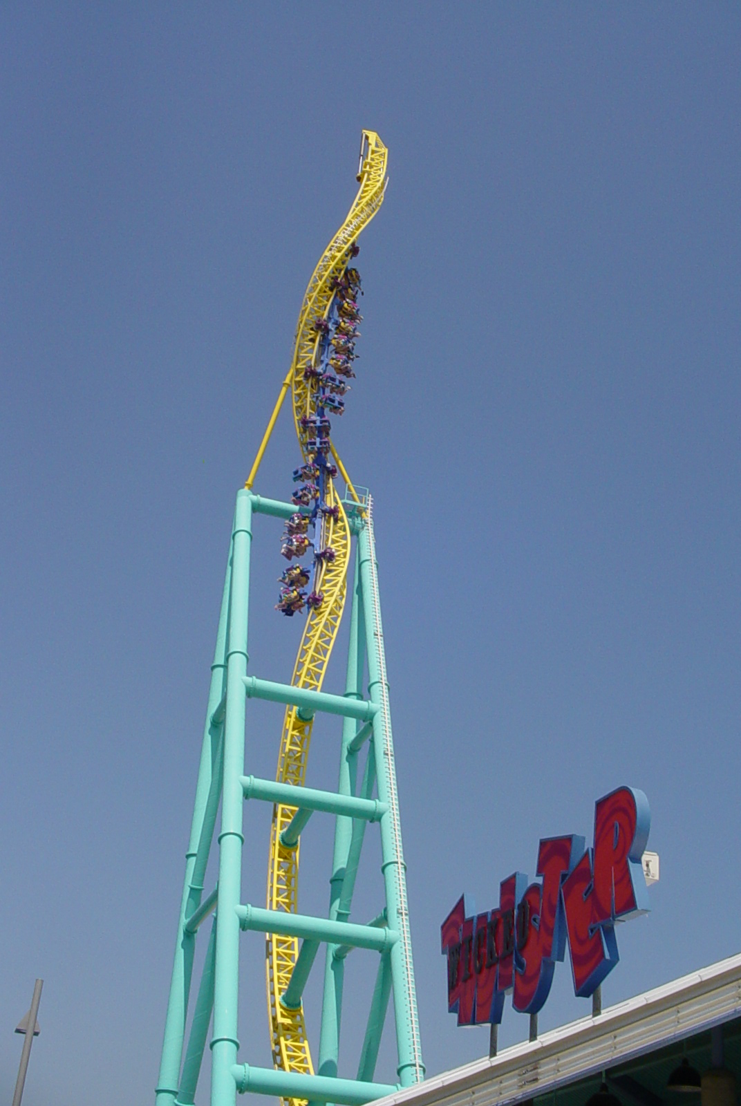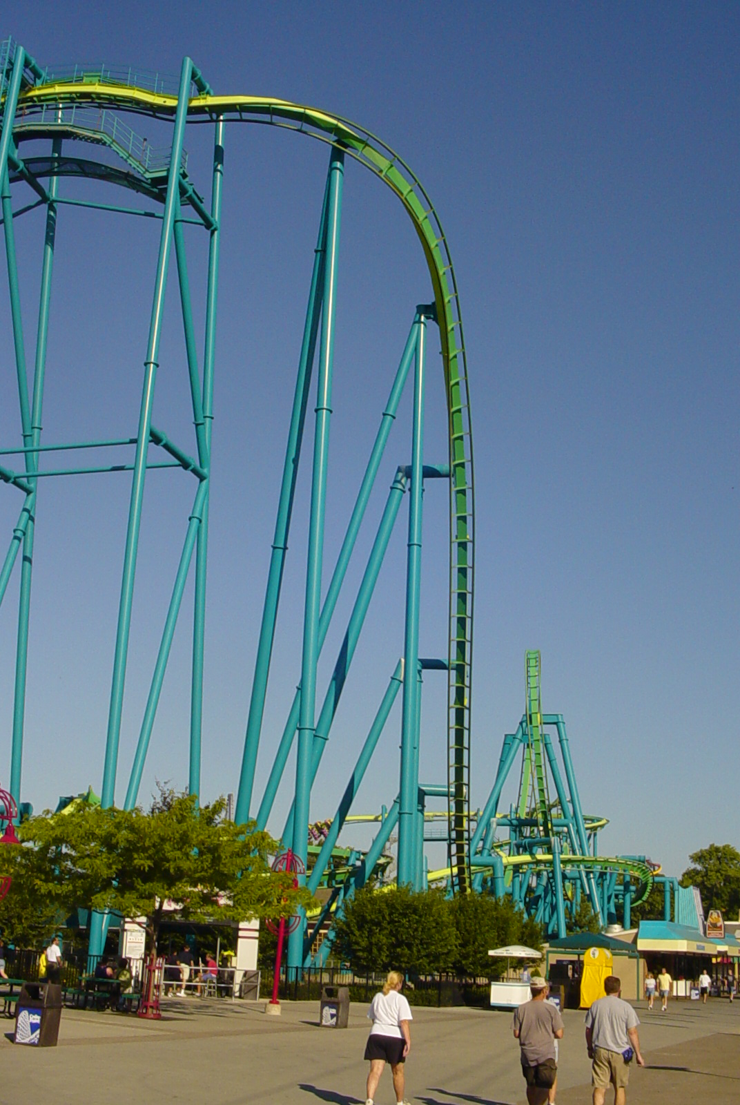 This monster of a coaster was designed and built by Intamin AG and it opened on May 4, 2003 as the worlds’ tallest at 420 feet, and the worlds’ fastest at 120 mph roller coaster. This coaster is also a launch coaster that rockets riders from zero to 120 mph in just over three seconds. Riders board the Dragster themed trains and are secured using a three-point seat belt harness and a lap bar that locks you into your seat. The train is then moved into the launch position right next to the “Christmas Tree” light stand. The Christmas Tree is something you see at drag racing events, it’s the stand of lights that sits between the two drag racers as they wait for the green light at the start line. As you approach the Christmas Tree, speakers turn on blaring sounds from a dragster revving their engine waiting for the green light and giving instructions to keep your arms down, head back, and to hold on. The Christmas Tree flashes three yellow lights and then the green and your off. The train ascends straight up the 420 foot tall hill just after the pneumatic catapult releases the train. Once up top, you can see for miles but only briefly as you then return to the ground but not before going through a 720 degree twist.