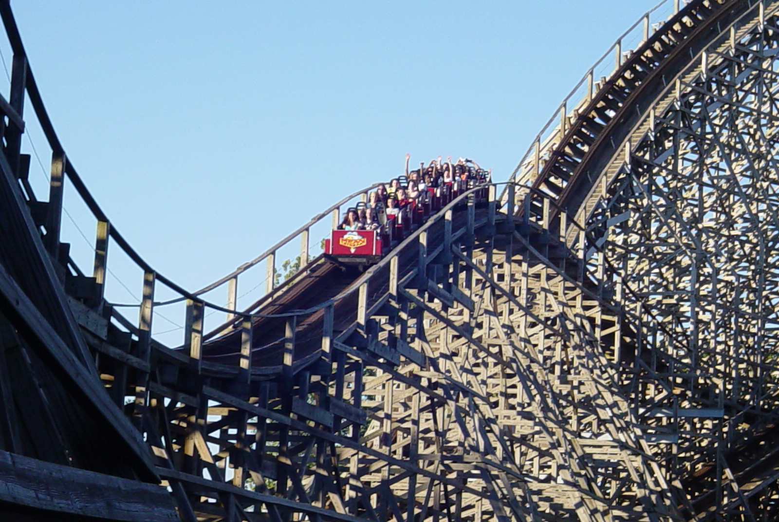 This coaster was built by the Dinn Corporation and is 5,427 feet long and has a ride time of about three minutes and thirteen seconds. When this coaster opened, it set two records for being the tallest, at 161 feet, and the fastest, at 65 mph, wooden roller coaster in the world.