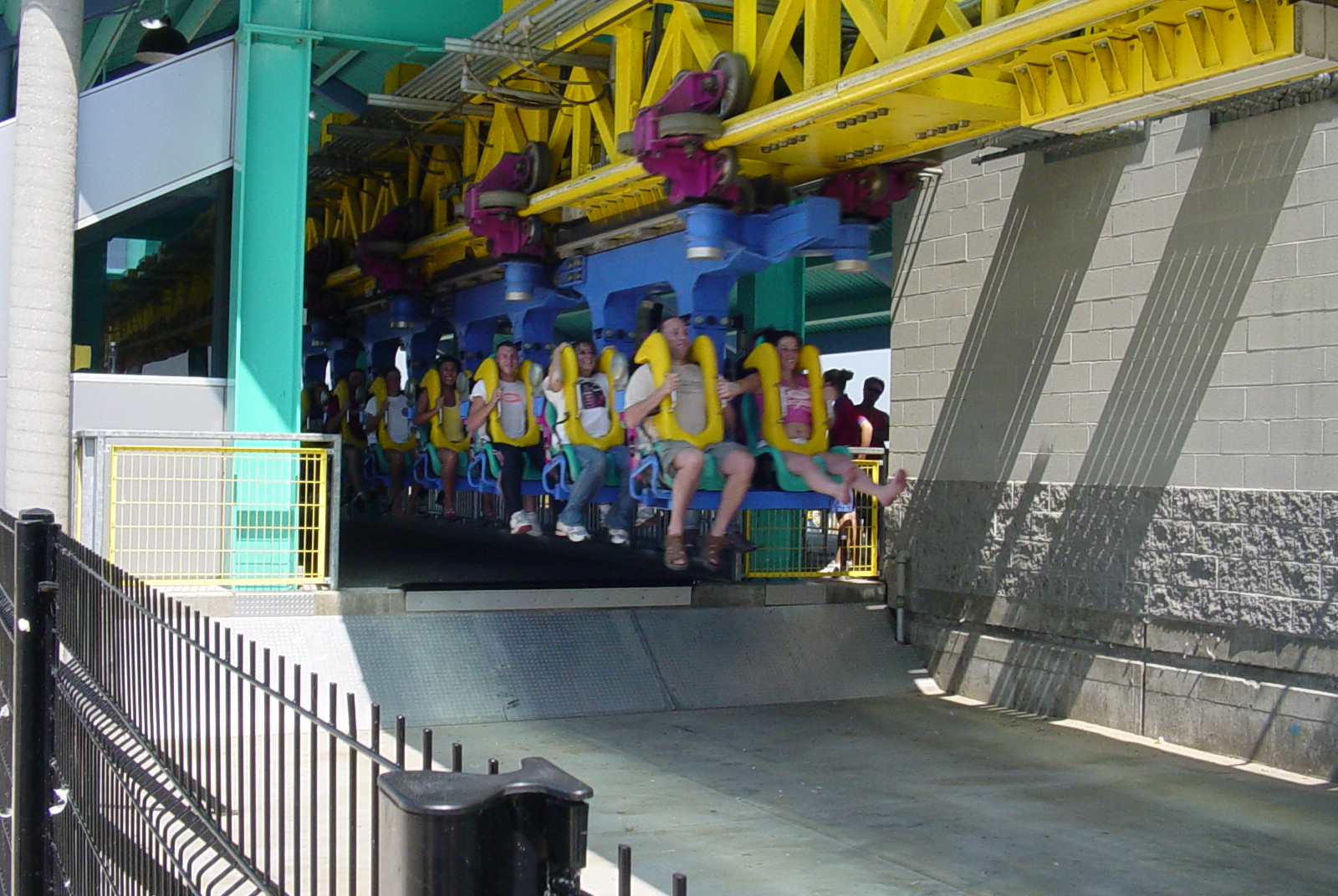 This is a steel racing roller coaster where the two trains race side by side thought the entire track. The reason I say this is a steel roller coaster is that the track is tubular steel track and the manufacturer, Arrow Dynamics, only produced steel roller coasters. This coaster is actually quite fun and you can actually reach over and barely slap hands with the other train, but only in the turns and only if the riders are about six feet or taller.