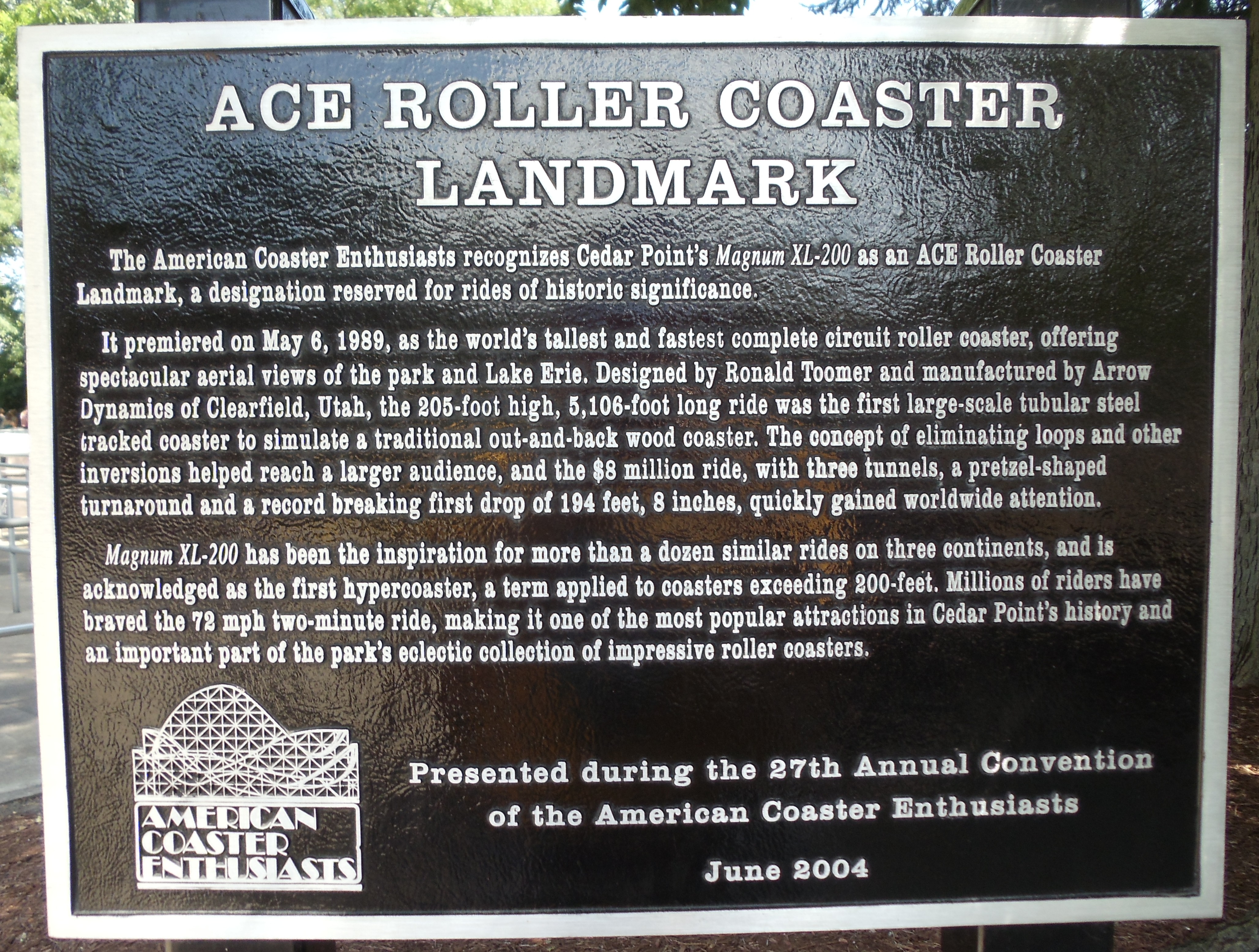 This coaster was built at a time when parks were building roller coasters with multiple inversions and it was thought at the time by most major park chains that people wanted to ride roller coasters with inversions and they wouldn’t necessarily ride a coaster that was basically a steel version of a wooden roller coaster. Cedar Point took the chance and built this coaster and put themselves on the map in the process. In one swoop, Cedar Point went from being a regional park to a destination park with the opening of this coaster. This ride proved all the experts wrong as it was an instant hit and it is still remains a very popular coaster. ACE (American Coaster Enthusiasts) gave this ride a “Landmark” status for its innovative design in simulating a traditional out-n-back wooden roller coaster. It also recognizes this coaster for being one of the first large-scale steel roller coasters to not feature inversions and that this coaster was the inspiration for many other roller coasters around the world. The plaque pictured below was awarded in June of 2004 and is located at the entrance to the ride.