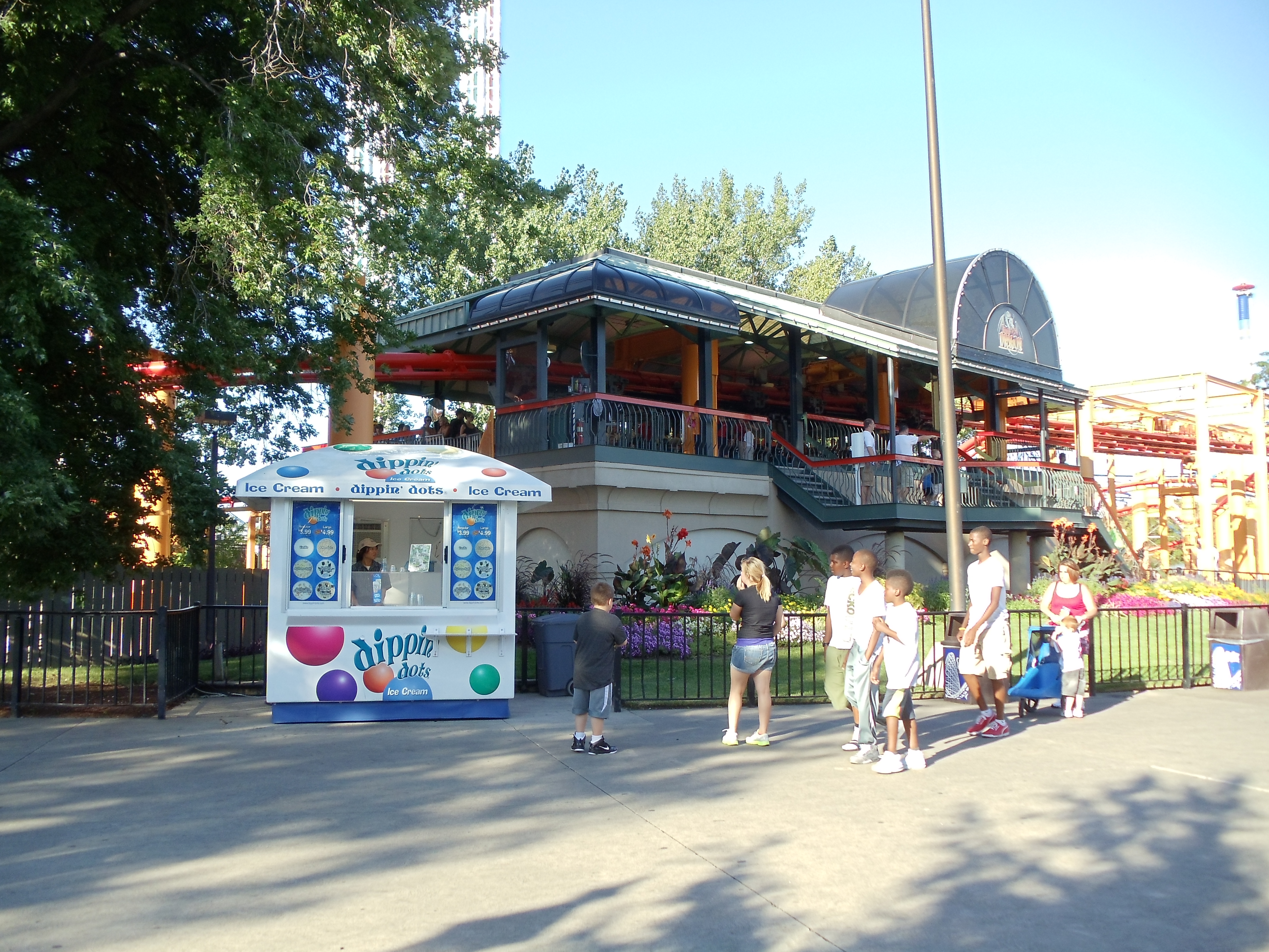 Now we’ll walk down the Million Dollar Midway, past the Coliseum and Skyride station and we’ve come to a fork in the road. We can either turn right and go towards Magnum XL200, or we can turn left and go down towards Millennium Force. This time we will turn right and the first coaster we come to was a record breaker when it opened. Sadly, this coaster closed on Sept 6, 2021, to make way for a new dining experience with the area around it being rethemed to the Boardwalk.