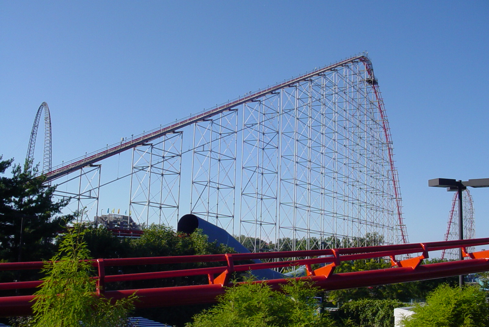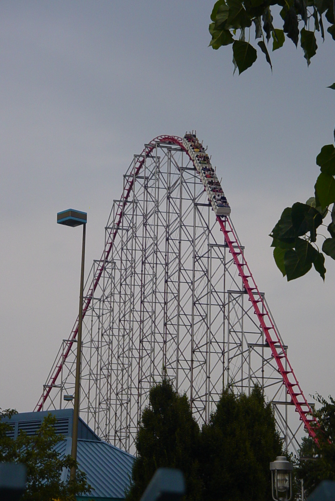 This coaster broke three records when it opened on May 13, 2000. It broke the height record becoming the worlds first Gigacoaster at 310 feet tall, it also broke the top speed record at 92 mph, and maximum drop angle at 80 degrees. A Gigacoaster refers to any roller coaster with a drop or hill between 300 and 399 feet in height. This coaster was also the first coaster to incorporate a cable lift system to pull the trains up to the top of the lift hill. You can see part of the lift system in the photo below.