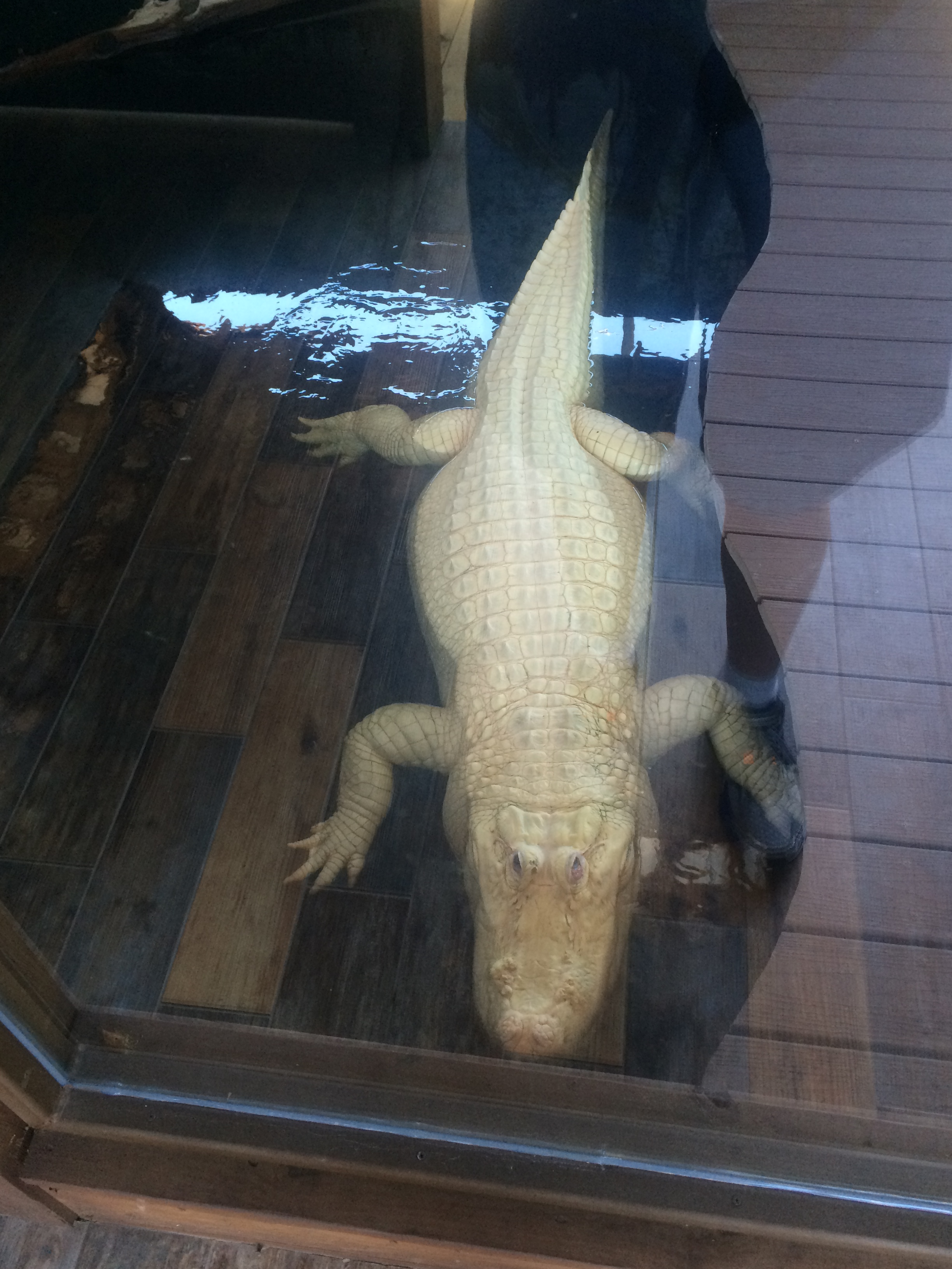 Bouya Blan is a Creole word for “White Fog”. Bouya is a rare albino gator and was found in the Bayous of Louisiana in 1987. It is really fortunate that he was found in time as albino gators cannot survive in the wild due to the lack of pigmentation in the skin. That pigmentation helps him blend into his surroundings and acts as a natural sunscreen. Bouya is also known as a “bull gator” which means he is the alpha male and he gets very aggressive to any other male that is in his area.