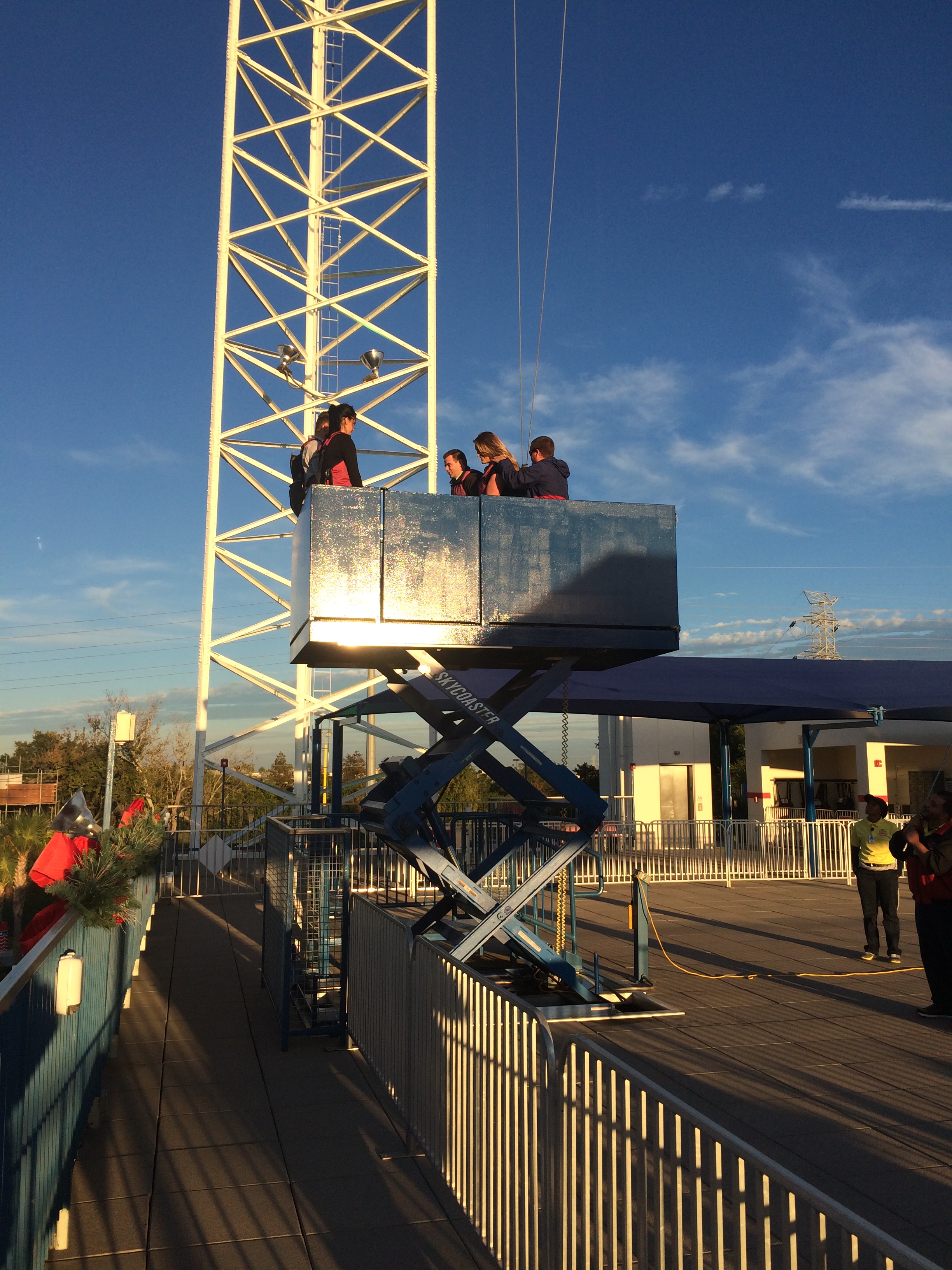 You’re allowed to swing back and forth a few times until gravity and wind resistance slow you down to a point where one of the ride operators tells you all to grab onto a ring that will bring your swinging ride to a stop. Then the scissor lift rises and disconnects you from the guide wires and then brings you to the ground.