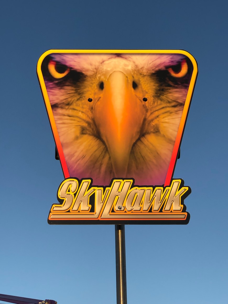 Skyhawk is 90ft tall and was built by A.R.M. and it occupies the spot that Air Raid used to sit in.