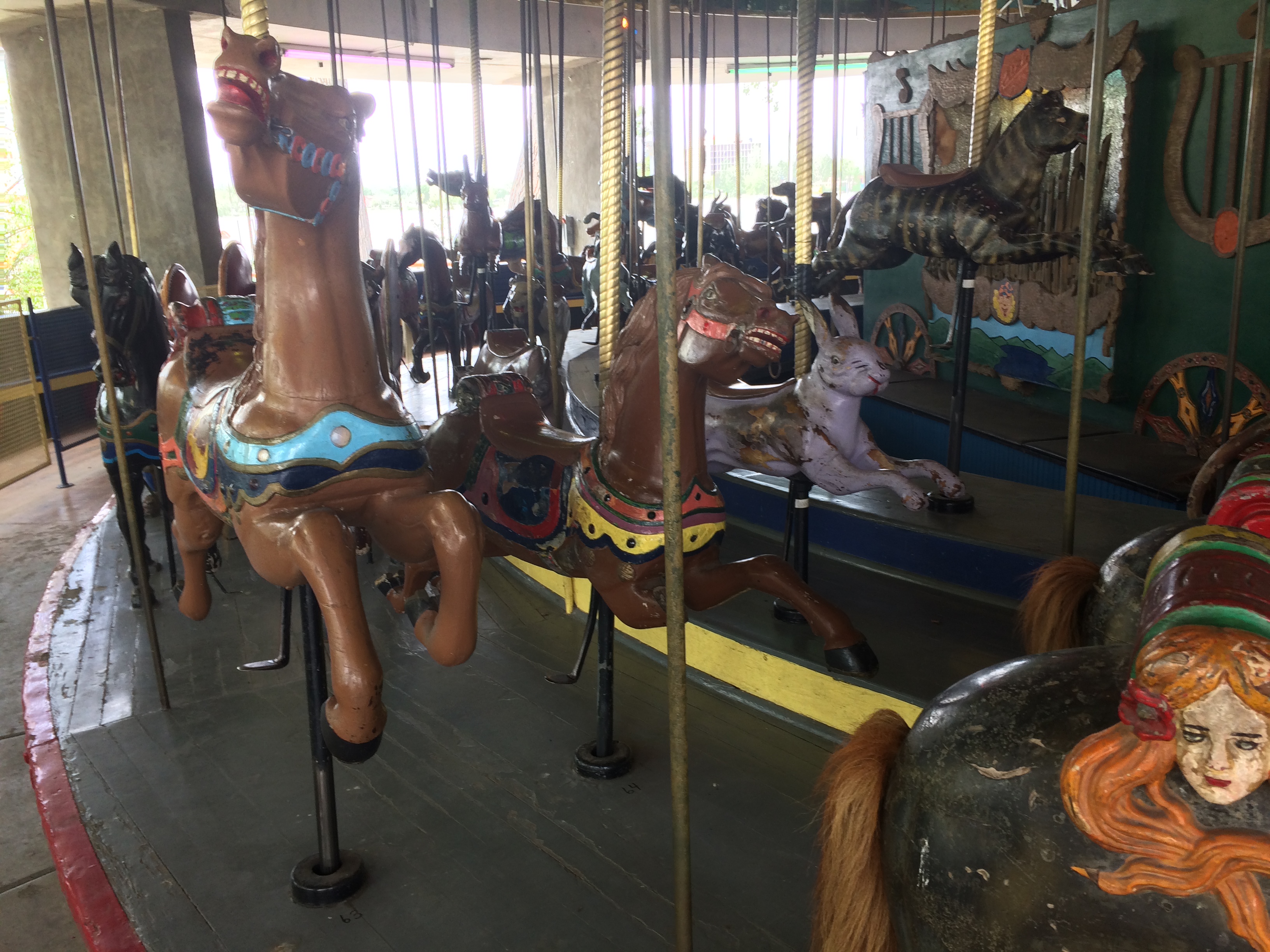 This carousel came from the C.W. Parker Co. and was built in 1908. What makes it unique is that there are possibly several other animals carved by noted carousel builders like Charles Looff. This one also has a multi-level platform instead of the normal one level platform. Also, most carousels have either inner or outer rows with standers, animals that don’t jump. This one has alternating standers and jumpers in every row. This carousel also has a menagerie that includes 16 jumping horses, 16 standing horses, and 40 menagerie animals (2 bears, 4 burros, 3 deer, 4 dogs, 2 tigers, 2 zebras, 2 panthers, 1 cheetah, 2 monkeys, and 3 cougars) there are also 4 chariots. All this information came from the National Carousel Association.