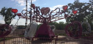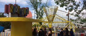 This is a Flying Scooter attraction from the Bisch Rocco Company which is still manufacturing and refurbishing these type of attractions since they opened in the 1920’s. You can alter the height of your tub by moving the rudder to the left and right at the right time.