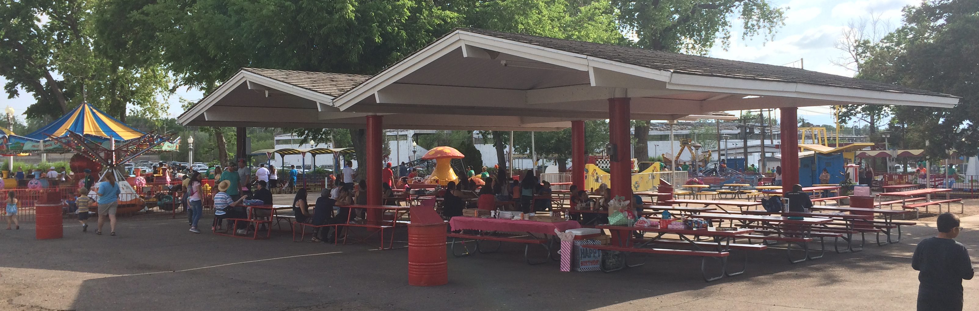 The park does have a very strict rule and doesn’t allow any professional type of photography or videography in their park so do as I did and stop by either the security or the main office and ask them about their policy. They DO NOT allow anyone to film their rides while riding the ride. They do allow you to take a picnic lunch into their park as they have several picnic pavilions on the south side of the park as you can see in the photos below.