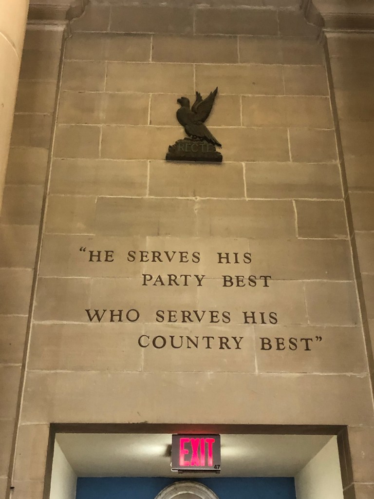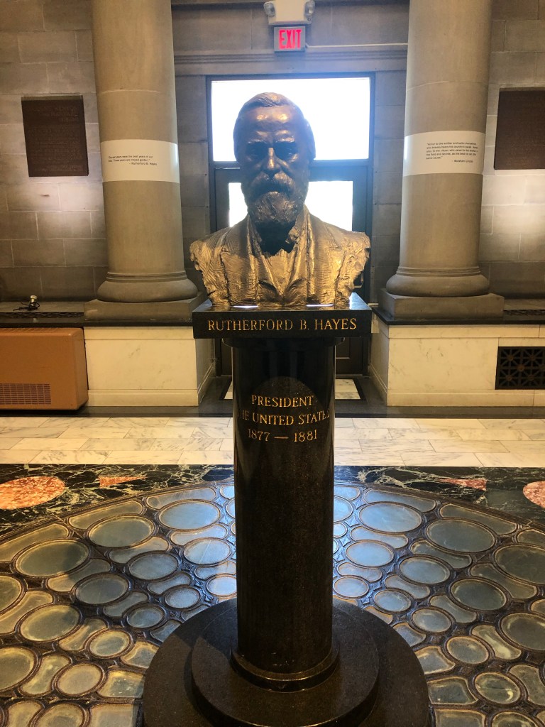 First off, we will visit the Presidential Library and Museum which is pretty impressive. The photo above is of the library and museum through the gates which used to be at the White House. Those gates were given to the Presidential Library and Museum by congress when they were removed so they could install wider gates so the firetrucks could fit through them. There are four such gates on property and all of them are being used as actual gates. In the original entrance, you will see a bust of President Hayes and one of his many quotes, “He serves his party best who serves his country best.”
