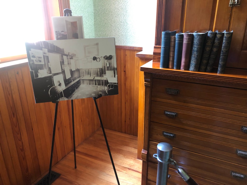 This is the room they call their, “Inner Sanctum”. This originally was a small washroom when the house was originally built but was expanded to its present size in 1883. The house also had indoor bathrooms when it originally was built. Rutherford had a small desk just to the left of the black and white photo on a stand with a door to the outside. Rutherford had this room expanded to its present size for Lucy who possibly had a series of gallbladder attacks and who also suffered from arthritis. He even included a modesty board in the bathtub.