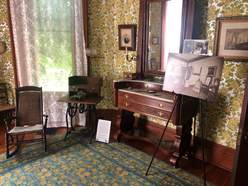The sewing machine was from the Wheeler-Wilson sewing company and was used by Lucy to mend uniforms when she visited Rutherford in camp during the Civil War. Earlier I mentioned that 97% of the objects in the house were theirs. Well, the field docent pointed out that Lucy used the hand mirror and Rutherford used the clippers to trim his beard. Both of those things are on the dresser.