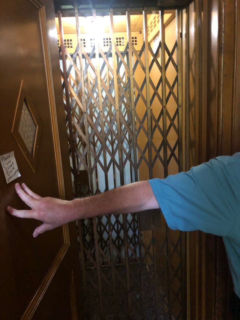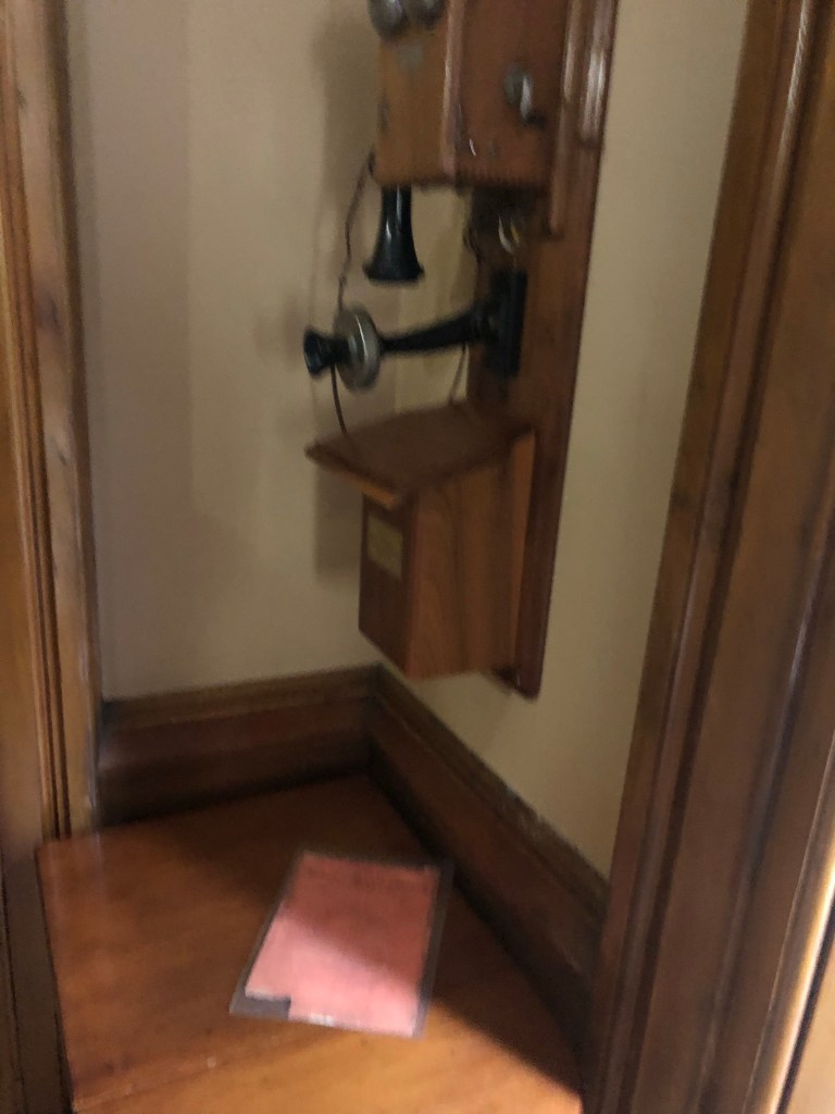 This is the Library which held all 12,000 books Rutherford owned as he loved to read. This was a favorite place for the family to gather much like the TV room or wherever the television is in the house today. Behind me is a horsehair stuffed chaise lounge that had a shallow hiding place under it and the carpet it is sitting on. Sadly, it was empty when it was discovered. The books in the library now were all donated by the citizens of Freemont as all of his books were all moved to the Presidential Library in the museum. Next up is a small hallway that contains a elevator that is original to the house, and a telephone room that has a card on the small desk on which is a directory that lists #35 belonging to General R. B. Hayes. The telephone was patented in 1876 and installed in Spiegel Grove in 1881. Hayes also had the telephone installed in the White House on May 1, 1879. I do apologize for the blurriness of the telephone room photo.