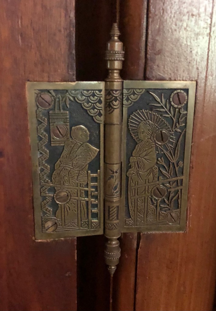 The next room is the Carriage Entrance which was the formal entrance to the home and sadly I don’t have any photos of it. This is an arched entrance with a door that is surrounded by crackle and bottle glass. Here is a look down the hall towards the dining room. Note the lighting fixture that is original to the house. Also look at the ornate door hinges as well.