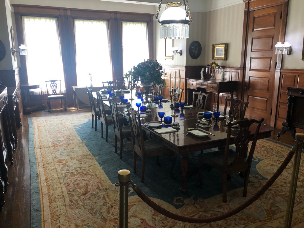 The next room is the Dinning Room. This was part of the last expansion in 1889 and really gave them a proper dinning room for all the guests that were visiting Spiegel Grove. The mahogany table is original to the house as is the China with cobalt finger bowls.