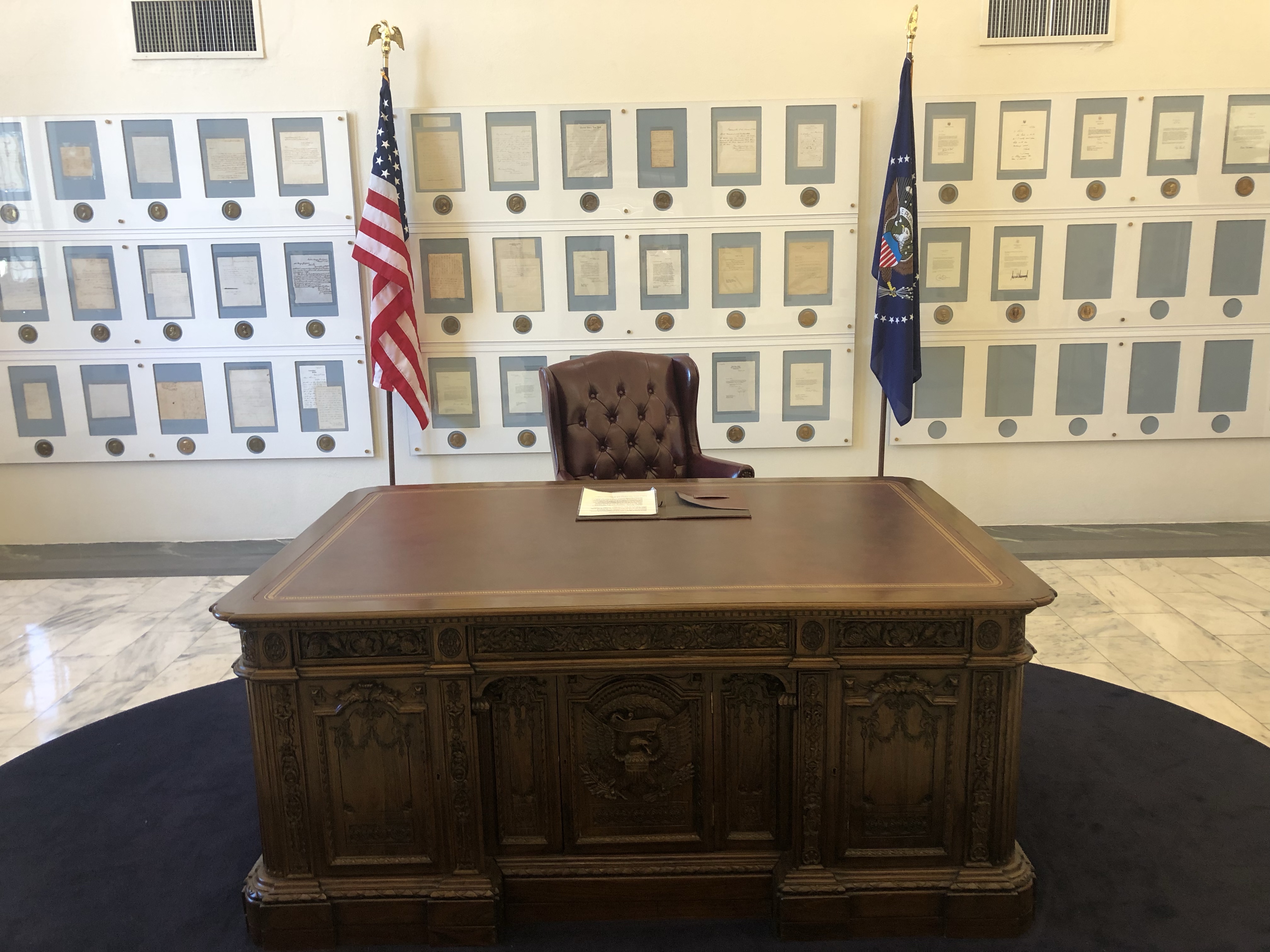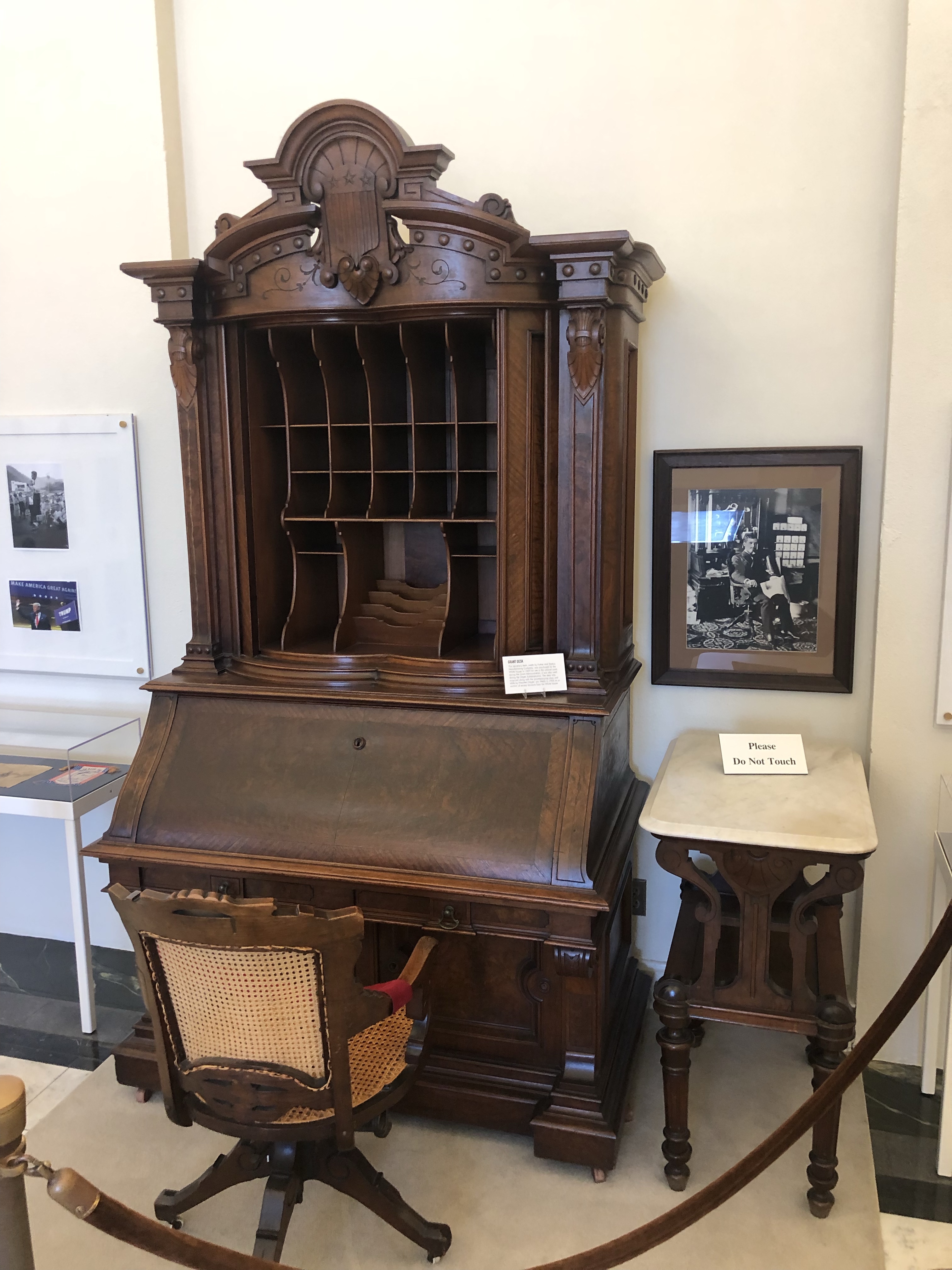 This is an exact copy of the famous Resolute Desk that now sits in the Oval Office in the White House. This was a gift from Queen Victoria of England and was received at the White House on November 23, 1880 where President Hayes put it in the Green Room for visitors to see before it was moved to his private office and study on the second floor. From there, it was moved to different places in the White House before it was put on display in the Smithsonian and even going on tour after President John F Kennedy was assassinated. The Resolute Desk was made from timbers of the H.M.S. Resolute which was a failed expedition that was sent in search of Sir John Franklin in 1852. The ship was found abandoned on May 15, 1854 by Capt. Buddington of the US Whaler ship, the “George Henry”. The ship was then bought, extricated, fitted, and sent to England as a gift to Her Majesty Queen Victoria by the President and people of the United States. The Queen then broke apart the ship as is customary for any ship coming back where the crew had not survived, and had the desk made from her timbers. Behind the desk are writing samples from every President the US has ever had. I found that most of them were well written except for one which was President John Quincy Adams. His writing was absolutely horrific to the point where he must have had arthritis as it was legible, but not very fluid at all. In that same room were President Grant’s desk and several items that belonged to President Abraham Lincoln including a few that were on his person the night he was assassinated in Ford’s Theater.