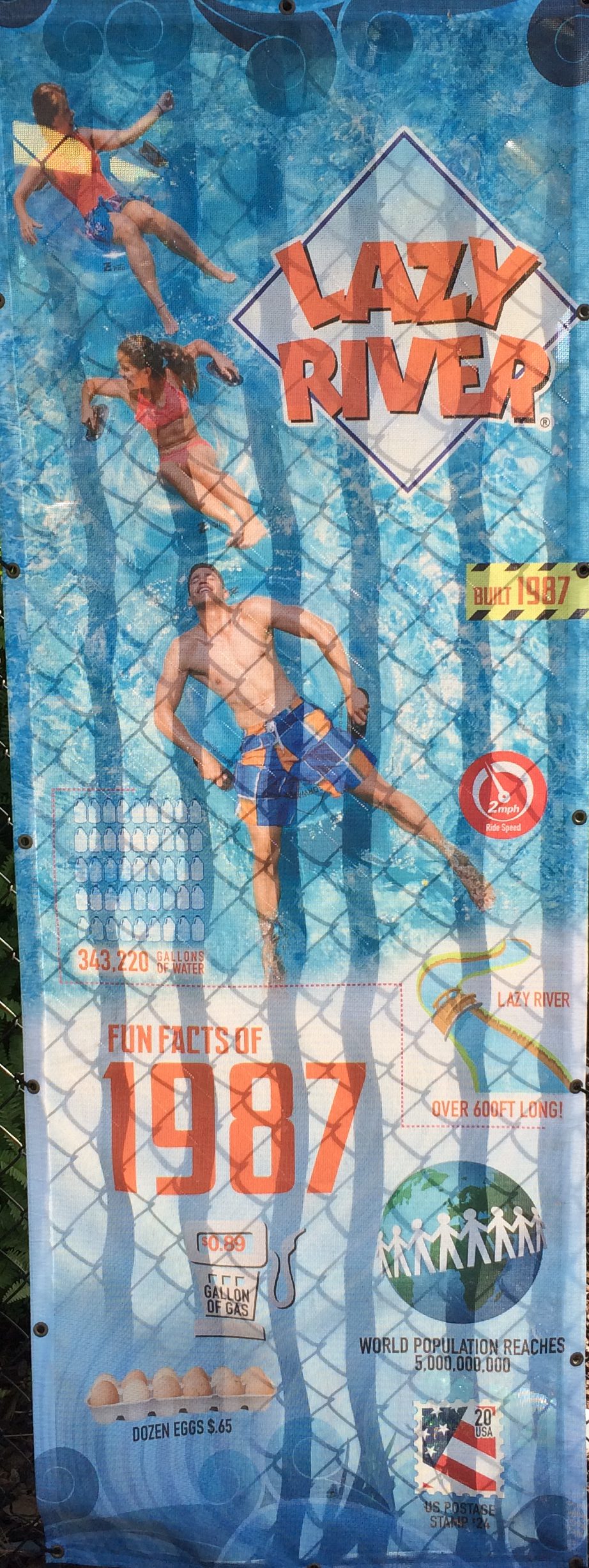 The park installed these banners advertising when certain attractions opened and their historical facts plus some interesting information on what was going on at that time.